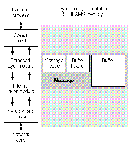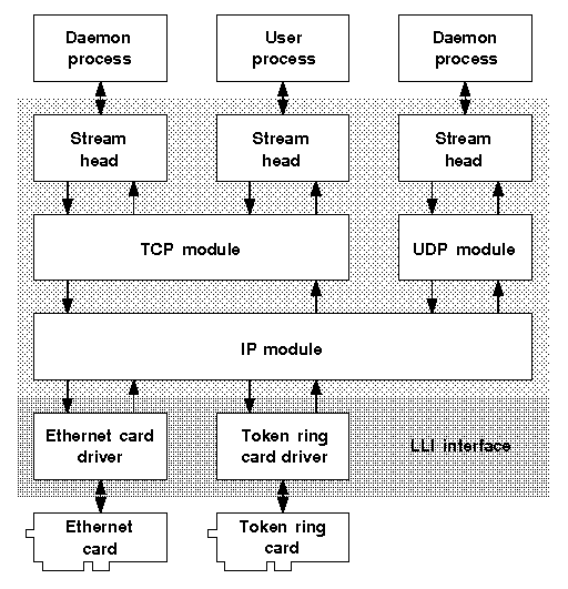 A network protocol stack is built by linking STREAMS protocol modules. For example, the TCP/IP protocol stack is built by linking the Internet Protocol (IP) module, and the Transmission Control Protocol (TCP) module. Modules can also be multiplexed so that a module can talk to several stream heads, drivers or other modules. ``Implementation of networking protocols using STREAMS'' shows: