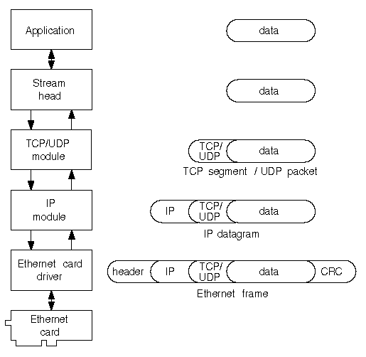 ``Creating an Ethernet frame by successive encapsulation'' shows how the TCP/IP protocol stack encapsulates data from an application to be sent over a network that uses Ethernet as the physical layer. The Transport layer module adds a header to the data to convert it into a TCP segment or a UDP packet. The Internet layer module turns this into an IP datagram, and then passes it to the network driver which adds a header and CRC trailer. The resulting Ethernet frame is then ready for transmission over the physical medium.