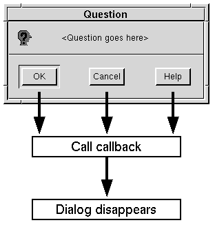 Question dialogs display an icon that looks like a question mark, ``Question'' in the title bar, and three standard buttons at the bottom: OK, Cancel, and Help.