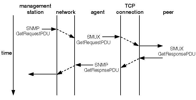The agent processes each variable in turn, and issues a GetRequestPDU or GetNextRequestPDU to the appropriate SMUX peer for each variable.