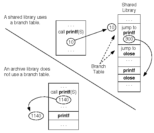 To avoid this, two options are available. The first is to recompile the library after each update. The second is to implement the shared library with a branch table. A branch table associates text symbols with absolute addresses. Each address labels a jump instruction to the address of the code defining a symbol. Instead of being directly associated with the addresses of code, text symbols have addresses in the branch table.