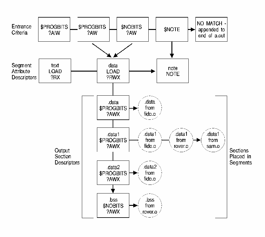 A typical (although somewhat simplified) map structure is illustrated in ``Simple map structure''. The ``Entrance Criteria'' boxes correspond to the information in the default mapping directives and the ``Segment Attribute Descriptors'' boxes correspond to the information in the default segment declarations. The ``Output Section Descriptors'' boxes give the detailed attributes of the sections that fall under each segment. The sections themselves are in circles.